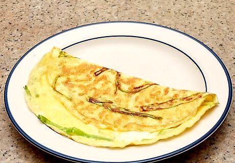 Combine the shaved asparagus with eggs. If you want to dress up your usual breakfast of scrambled eggs or an omelet, add some shaved asparagus to the eggs. It pairs especially well with goat cheese and grated Fontina, so you can have creamy, delicious eggs with the earthy flavor of the asparagus. Adding asparagus ribbons to scrambled eggs or omelets is an especially tasty option if you’re preparing them for brunch or dinner.
