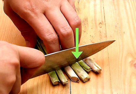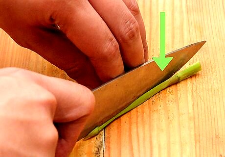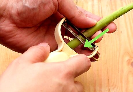 Cut the final layer of the stalks into thin strips. In many cases, you’ll be able to shave the entire spear with the vegetable peeler. However, if you find that the final layer of the stalk is too hard to peel, use a sharp knife to cut it into thin strips. Don’t worry if the strips you cut aren’t as thin as the shavings. They’ll blend in just fine.