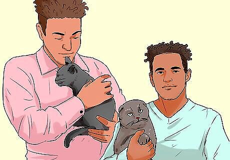 Spend an equal amount of time with each cat. If you spend more time with one of your cats, then the other cat might be competing for your attention. Therefore, make sure to play, pet, and comfort both or all of your cats throughout the day. For example, if you are playing with one of your cats, make sure to set aside some time to play with the other one too, or play a game that involves both of your cats.