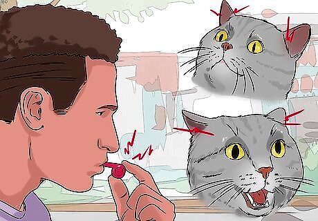 Make a loud noise. Blow a whistle, clap your hands, or do something that will produce a loud noise. The loud noise will distract your cats, allowing you to break up their fight. You can also say loudly, “Hey” or “Stop it” in addition to making a loud noise.