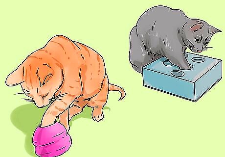 Provide enough toys. Make sure to have a variety of toys available so your cats do not have to fight over them. Additionally, enhance your cats’ environment with puzzles, food dispensing toys, and other toys that are safe for your cats. This way, your cats can release their pent up energy on their toys instead of each other.