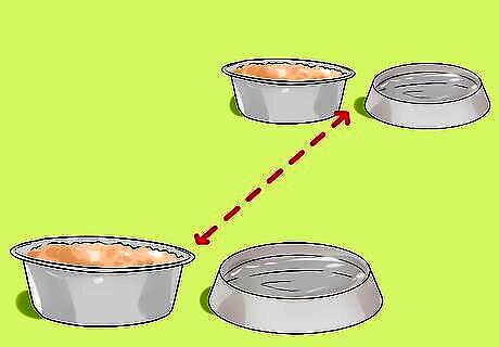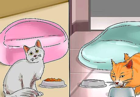 Keep food and water bowls separate. Make sure each cat has its own food and water bowls. Keep their bowls separate in different areas of the house. This way, your cats will not feel as if they are in competition with one another over valuable resources like food and water.