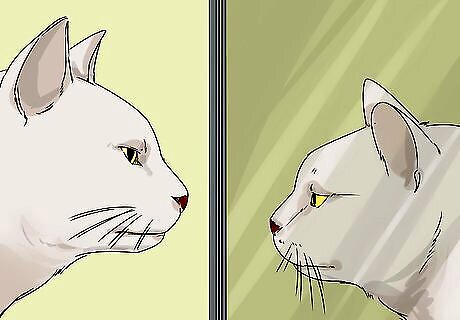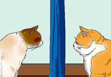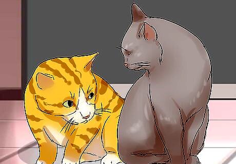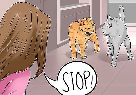 Stop fights before they start. Cats that are about to fight may be staring at each other while growling, hissing, or spitting. Their hair may be standing on end or puffed up, especially the hair on their tail. Additionally, their ears may be positioned backwards and close to their head. Look for an arched back as well. If you happen to find your cats in this situation, step in right away to prevent a full-on fight.