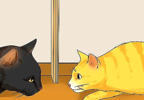 Crack their doors slightly. Once your cats are comfortable with seeing each other from a distance, you can start to crack their doors open as they eat. Have them see each other as they eat, but make sure they are far enough apart so they do not feel threatened. Feed them a small amount of food to keep the sessions brief. Gradually increase the length of the sessions as your cats become more comfortable with each other. Use a doorstop or a hook-and-eye closure to prevent the doors from opening if one of the cats decides to charge or confront the other one.
