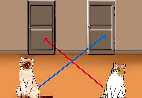 Swap their rooms. Take one of the cats and its food bowls, litterbox, bed, and toys to another room and close the door. Then move the other cat and its possessions to the first cat's room and close the door. Finally, place the first cat and its possessions in the second cat's room and close the door. Swap their rooms every three days. Do this after several days of being separated. Swapping rooms will allow your cats to become accustomed to each other’s scent.