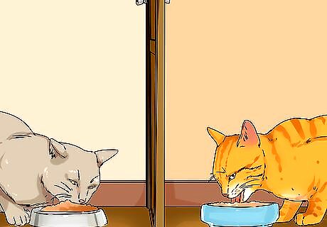 Feed them on opposites sides of a door. Do this by placing each cat's food bowl near the closed door. This will force your cats to be close together while doing an activity that they enjoy, thus helping them associate more positive experiences with each other. If both or one of your cats is still uncomfortable, try placing their food bowl a little farther away from the door. Gradually move the food bowl closer to the door over the course of several days or a week.