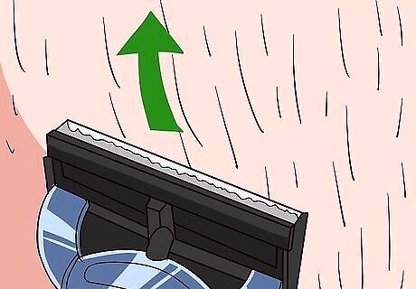 Shave in the direction of your hair's growth without pulling the skin. Don't stretch your skin to flatten it out when you shave and don't shave against the grain. Shave in the same direction you're your hair is growing to avoid ingrown hairs an irritation. For example, if your hair is growing downwards, shave downwards as well. Don't shave up.