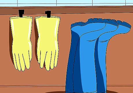 Dry out your rubber gloves and boots when you're not using them. If you wear rubber gloves to do household chores or for your job, make sure to remove them and hang them up to dry out after each use. After wearing rubber boots, remove them and set them on the ground with the open ends up to air out. Gloves and boots may take 8 hours or longer to dry out completely. If your rubber gloves or boots are damaged and water leaks in, replace them as soon as possible.