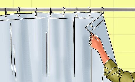 Wash shower curtain liners and bathroom rugs often. These items get wet every time they’re used, so it’s necessary to wash them and let them air dry every one or two weeks. Throw your plastic liner in the washing machine along with a load of whites, detergent, and a dash of baking soda. After it’s clean, hang the liner out so it can air dry. Wash your bathroom rug in the washing machine with cold water and a gentle laundry soap. Tumble the rug dry on the coolest heat setting possible.