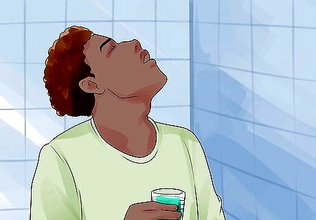 Gargle with non-alcoholic mouthwash. Mouthwash that contains alcohol will dry out your mouth, and a dry mouth will lead to the build-up of smelly bacteria and bad morning breath. Look for mouthwash that is alcohol-free, and with antiseptic or antibacterial properties. Though mouthwashes may advertise minty fresh breath, if they contain alcohol or don’t have antibacterial properties, they will just act as a cosmetic rinse and won’t really keep your breath fresh overnight. You can also gargle with baking soda and water before bed. This will create an alkaline environment in your mouth, which is good for killing bacteria. Be sure to avoid baking soda, though, if you have braces or a permanent retainer, as it can soften your glue. Put a teaspoon of baking soda in a cup of water and gargle the solution for one minute. You can also swallow some of the solution to coat the back of your throat (it’s not harmful). Be sure to spit out the solution and avoid rinsing your mouth before going to bed.