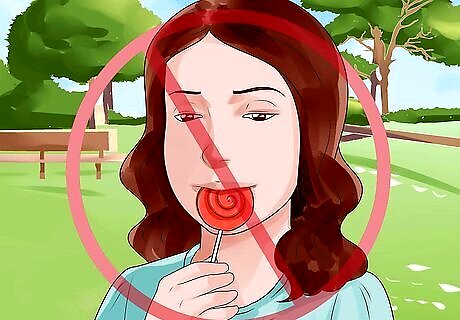 Reduce your sugar intake. Sugary foods leave traces of sugar in your mouth. These traces act as food for the bacteria in your mouth to thrive on, which then develop into acid that can contribute to tooth decay and tooth erosion, not to mention stale breath. Avoid snacking on sugary foods such as candy and sweets. Limit your consumption of fizzy drinks, including fizzy water and fruit juices, because these are usually very acidic. If you do drink fizzy drinks such as soda, drink them quickly through a straw. Don’t swish them around in your mouth or hold them in your mouth for a long period of time.