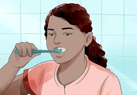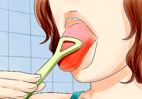 Clean your tongue once per day. If you have morning breath, chances are you have a thick, white coating on the back of your tongue. This is an accumulation of bacteria on your tongue that causes bad breath. So it’s important to clean your tongue at least once a day to remove this bacteria. You can dip a soft toothbrush in non-alcoholic mouthwash and scrape your tongue, removing the bacteria. You can also buy a special plastic tongue scraper from your local pharmacy. Place it as far back as you can on your tongue and then gently scrape forward to remove the bacteria.