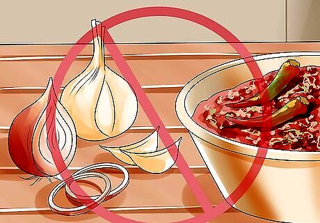 Avoid garlic, onions and spicy foods. These foods will create very strong smells in your mouth. Chronic garlic eaters not only have chronic bad breath, but they also have strong body odor because foods such as garlic and onions contain acids that stay in your body long after you eat them.