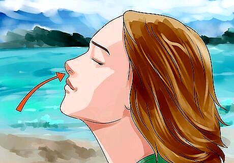 Practice breathing through your nose, rather than your mouth before bed. Before you go to sleep, think of the proverb: “The nose is for breathing, the mouth is for eating.” Try to train yourself to breathe through your nose as you sleep by doing several rounds of conscious nose breathing. Sit up straight in a comfortable position. Relax your upper body and close your mouth. Rest your tongue behind your bottom teeth, away from the top of your mouth. Place your hands on your diaphragm, or your lower belly area. You should try to breathe from your diaphragm, rather than from your chest area. Breathing from your diaphragm is important because it helps your lungs with gas exchange and it massages your liver, stomach, and intestines, working the toxins out of these organs. It will also relax your upper body. Take a deep breath in with your nose and inhale for two to three seconds. Exhale through your nose for three to four seconds. Pause for two to three seconds and breathe in again through your nose. Practice breathing like this for several rounds of breaths. Extending your inhales and exhales will help your body get used to breathing through your nose, rather than your mouth.