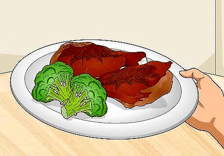 Have a meal of lean proteins and green vegetables before you go out. When you drink, your body metabolizes the alcohol before anything else, which means if you eat a meal heavy in carbs and fat before you head to the bar, you're more likely to gain weight. Instead, choose a lean protein, such as grilled chicken, along with some green vegetables, such as broccoli or spinach. The calories in alcohol might tempt you to skip a meal before going out drinking, but generally, this is a bad idea. Eating before you go out slows the rate at which the alcohol is absorbed into your bloodstream, allowing you to better control your drinking the effects the alcohol has on your mind and body.