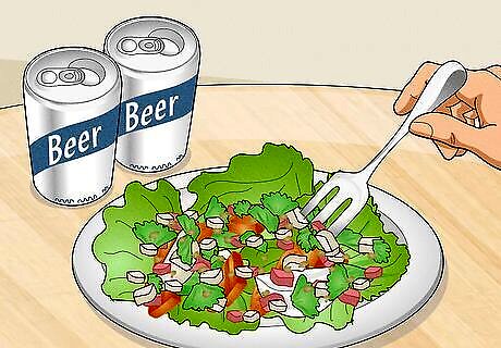 Reach for vegetables if you get the munchies after drinking. A drink or two might have you feeling hungry, and bars often keep plenty of options on hand to satisfy that need. However, a lot of "bar food" is fried and contains a lot of fat and carbs that will only cause you to pack on the pounds. If there's a salad on the menu, go for that instead. Finding healthy food can be particularly difficult if you spend a late night out on the town. Rather than satisfying your craving for a greasy burger or stuffed burrito, head home and chow down on something healthier, such as a salad with lots of greens and other brightly colored vegetables. If you know you're going to be out drinking, prep something before you leave so you'll have a healthy food option when you get home without having to think about it. Having something ready for you at home can also help you resist the urge to buy something while you're out.