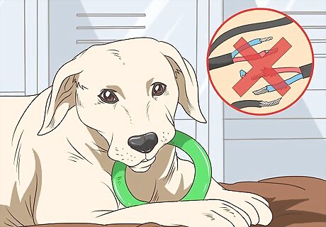 Do not allow your pet to chew on electrical wires. Some pets chew almost anything. While normally this habit is just irritating, if your pet starts chewing on electrical wires, the situation can quickly become dangerous. Frayed electrical wires can cause house fires, so train your pet to chew only on appropriate chew toys. Say, “No,” to your pet in a loud, stern voice if you see them chewing on wires. Provide chew toys or other distractions for your pet so that they do not play with cables and electrical wires. If you need help training your pet not to touch electrical wires, consult a professional pet trainer to help. Alternately, you could apply an even coat of liquid soap to the electrical cord to keep pets from chewing it. Use a dishrag or disposable towel coated lightly with liquid soap and wrap it snugly around the cord. Move the rag from one end of the cord to the other. Do not get any soap on the prongs of the cord that connect to a device or an electrical outlet. The next time your pet chews on the cord, it will quickly stop because of the soap’s bitter taste. Try to hide wires behind large appliances and furniture. Use wiring covers – long tubes you can use to conceal your wires and keep them out of your pet’s reach. If all electrical wires are out of reach, your pet will not be able to get into trouble with them. Dispose of any fraying cords your pet has actually chewed through.