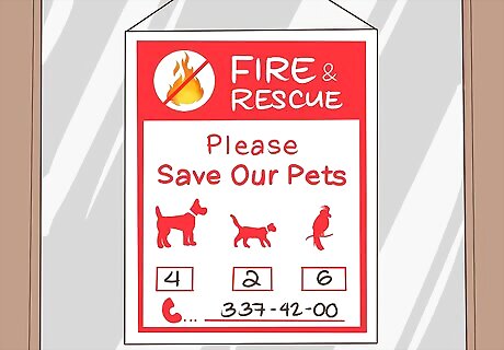 Use a pet alert window cling. A pet alert window cling is a small reusable sticker or hanging sign that you can place in your window to indicate to emergency responders how many pets are in your home. Most pet alert window clings have a blank space for a numeral next to the words “Dog(s),” and “Cat(s),” with another line for “Other.” Enter the appropriate information on your pet alert window cling and place it in your window or glass storm door.