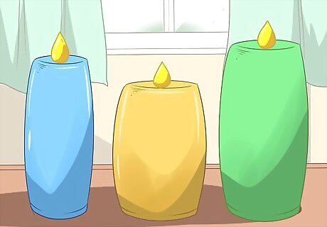 Use flameless candles. “Flameless candles” sounds like a contradiction. That’s because flameless candles are candles only in appearance. Instead of a wick that you have to light, flameless candles have a small switch on the bottom and an LED light on top. When you turn the device on, it emits a warm glow similar to that of a candle. Since flameless candles don’t involve actual flames, there is no danger of your pet starting a house fire by knocking one over. Real candles, on the other hand, might accidentally be knocked over by pets.