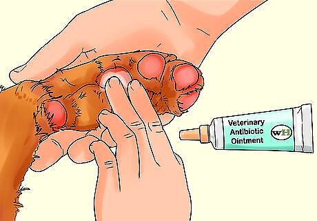 Treat burns on the pads. If your dog's pads do get burned by a hot surface, it's important to treat them so they can heal properly and quickly. If they have a slight burn, soak the pad in cool water, dry it off, apply a veterinary antibiotic, and then bandage them up. If the pads are severely burned, they should be treated by a veterinarian. Signs that your dog's pads have minor burns include the dog slightly limping, being hesitant to walk, and licking the pads after a walk in the heat. However, with a minor burn the pads themselves will look normal. Severe burns can be identified by looking at the pads. They will have areas that are discolored or blistered.