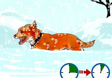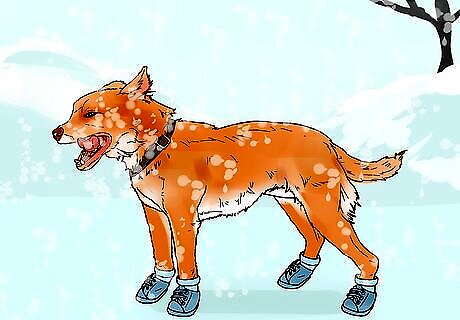 Put booties on your dog's paws. If you plan to have your dog out in the ice and snow for a long time, you can get booties that will protect their paws. Dog booties are available at pet supply stores and online retailers. These booties can be hard for a dog to get used to though, so gradually acclimate your dog to them over several weeks before you need it to wear them for an extended period. When buying booties for your dog, be sure to get the right size. You will need to measure your dog's paws and get a size that is designed for your dog's paw size. Make sure you get booties that have rubber soles and that are waterproof. These things will help protect the dog's paws and will give it stability on the ice or snow.