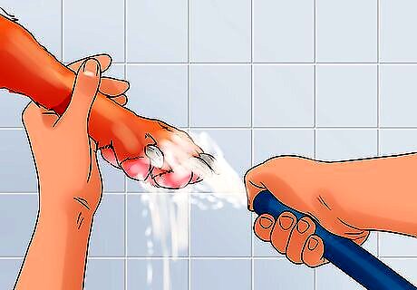 Wash your dog's paws after contact with salt and chemicals. One of the major hazards for your dog's paws in winter is the salt or chemicals that are used to deice roads and sidewalks. Every time your dog spends a lot of time outside in areas that have been deiced, be sure to wash their paws afterward. Simply rinse the pads with warm water and then dry them off with a towel. Salt and chemicals are dangerous for your dog. They can injure the surface of the pads. They can also be ingested if the dog cleans its pads with its tongue.