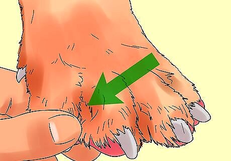 Be sure to look between your dog's toes. When inspecting your dog's paws for damage, you also need to look for problems between the toes, most often due to thorns or burrs getting embedded there. Removing these items quickly is important because they can easily cause infection and pain. If you spot a burr or thorn, use tweezers to remove it. Be gentle so that your dog is not resistant to your efforts, but also make sure you get a secure hold on the whole thing. A small piece that's broken off and left behind can be even harder to remove. If you cannot remove a burr or thorn completely, seek veterinary help. Leaving them embedded can create a severe infection and can impact your dog's ability to walk, so proper veterinary care is vital.