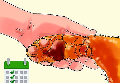 Check your dog's paws regularly for damage. In order to protect your dog's paws from serious injury, it's important to keep an eye on their condition. Inspecting them on a regular basis for cuts, cracks, or punctures can help you catch problems before they become serious. If you take your dog running or hiking, make sure you're checking its paws throughout your trip. If they look worn down, let your dog rest.