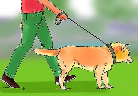 Keep your dog on cooler surfaces. If you do take your dog outside during hot weather, make sure it is walking on grass or other cooler surfaces. Keeping your dog on vegetation will help it avoid burned pads. Consider taking your dog for a walk on a bark or dirt path instead of a concrete path.