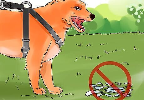 Keep your dog away from sharp objects on the ground. A dog's paws can be easily injured by walking on sharp or rough objects. Either keep your dog totally out of areas with sharp objects on the ground, or clean up the ground thoroughly before bringing your dog into one of these areas. For example, keep your dog out of work areas where metal shavings or glass fragments could be on the ground. As a rule of thumb, don't have your dog walk anywhere where you wouldn't walk barefoot.