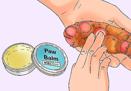 Moisturize your dog's paws. If your dog spends any amount of time outside during the winter, it will likely need a bit of additional moisture added to its pads. Moisturizer for dog paws, commonly known as paw balm, can keep the pads supple and free of cracks or brittleness. Apply it both before and after your dog spends time in the cold. Use a moisturizer that is designed for the pads of dog' paws. This type of moisturizer can be found at pet supply stores and from online retailers. You can also make your own paw balm out of common household ingredients, such as coconut oil, olive oil, and shea butter.