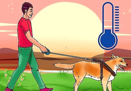 Walk your dog at cooler times of day. If you want to take your dog for a long walk in the summer, do it when the ground will be at its coolest. Early in the morning or long after sunset are usually good times to take dogs for walks. In addition to protecting your dog's paws, walking it during cooler temperatures will protect it from getting heat exhaustion and dehydration.