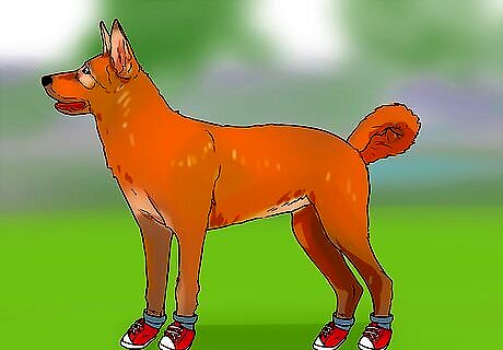 Put paw protection on your dog. If your dog will put up with having something on its paws, you can use booties in the summer. Put them on your dog before taking it out in areas where it will walk on hot concrete or other hot surfaces. Booties are also a good choice if you're taking your dog for a long hike. They'll protect its paws from cuts and scrapes.