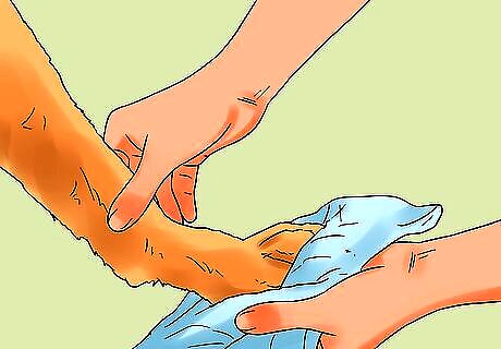 Wipe down the dog's paws after contact with ice and snow. Once you have brought your dog in from the cold, be sure to remove any ice, snow, or water that has accumulated on its paws. This will help keep the paws healthy and will minimize the chance of frostbite or raw skin. Be sure to check between the toes for ice and snow. Sometimes ice balls can form between a dog's toes. If you notice your dog limping during the walk, make sure there aren't ice balls stuck to its paws. Wiping down the paws can also remove some of the salt and chemicals that can accumulate on the surface of pads.