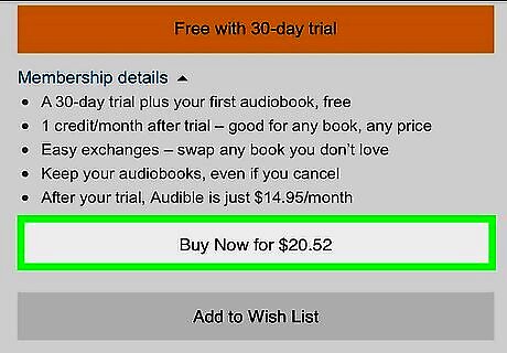 Tap Buy Now for $XX.XX. It's below the "Publisher's Summary" section. $XX.XX will be the price of the book. Prices vary depending on the book. If you have Audible credits on your account, you may see the option "Buy Now with 1 Credit" as well.