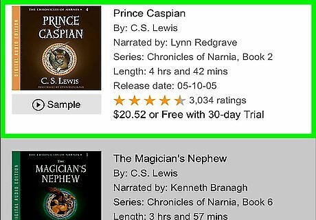 Tap a book in the search results. Tap the cover image or title of any audiobook you want to purchase.