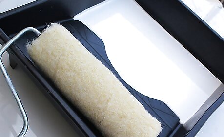 Pour paint for the base color into a paint tray. Use latex paint for the base color. This type of paint is easy to work with and to clean up and will provide a smooth base underneath the rag pattern. The base color latex paint is usually a lighter shade, so the glaze color that is rolled on top with the rag will stand out on top of the base coat.