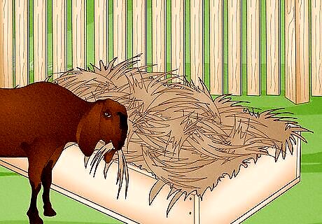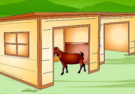 Give your goats access to shelter. As mentioned in the previous section, goats will require a sheltered indoor area for sleeping, feeding and protection from the weather and night-time predators. The housing does not need to be very elaborate, and as long as the goats have plenty of outdoor space to roam around during the day, it doesn't have to be very large - goats like to sleep together in small groups. You just need to make sure that the shelter stays dry and draft-free. It's also a good idea to have a small stall where you can place sick, injured or heavily pregnant goats. The floor of the shelter should be covered in a thick layer of bedding, comprised of wood shavings (anything except cedar), straw or waste hay.