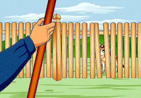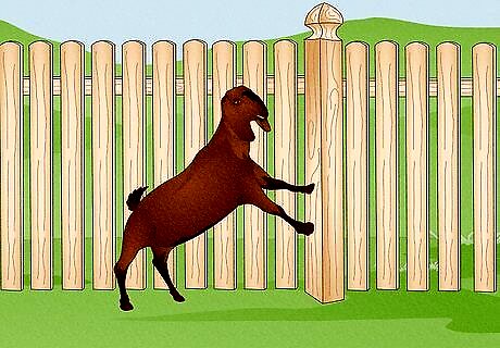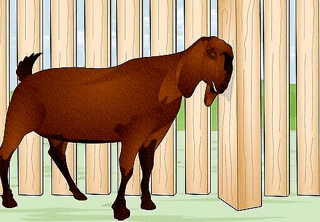 Build a goat-proof fence. Goats are notorious escape artists, as they can climb trees, jump over fences, chew through rope and wriggle their way through the smallest of spaces. Therefore, it is essential that you erect a strong, goat-proof fence around the enclosure. Your fence should be a minimum of four feet high, or five feet for more active goat breeds such as Nubians. Wooden, stock panel or chain-link fences are all good options if you are building a new fence. However, if you simply want to goat-proof an existing fence, you can use high tensile, smooth electrified wire. Also make sure to brace any gates or fence posts on the outside of the fence as this will prevent goats from climbing up them. You should also make sure that the goats' shelter does not have an easily climbable roof.