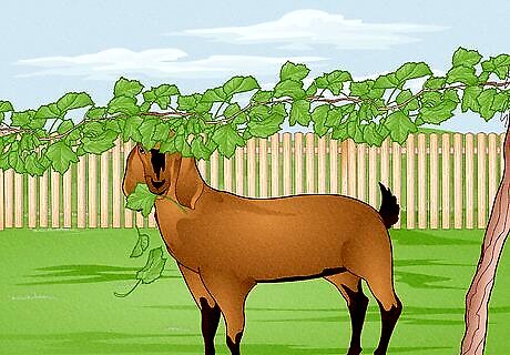 Allow your goats to browse. Goats are browsers rather than grazers, which means that they prefer to eat twigs, leaves and weeds rather than plain grass. This allows goats to be raised alongside sheep, cows and horses, as they do not compete for food. Goats can also be used to clear rough land and get rid of unwanted vegetation. If you live in a green or wooded, rural location, feel free to put your goats out to pasture and let them forage for things like young shrubs and saplings, blackberry canes, poison ivy and clover, to name but a few.