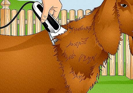 Keep your goat clean and trimmed. In general, goats don't require too much grooming (except for the long haired varieties), but you will need to give them some attention every now and then in order to keep them clean and comfortable. Brushing and bathing: Goats should be brushed at least once a year (preferably at the start of summer when they're shedding) with a firm-bristled grooming brush. This removes dandruff and loose hair, stimulates blood flow, and gives you a chance to check for any lumps on the skin or other signs of diseases. Bathing your goats is not strictly necessary, but it helps to remove lice and makes clipping easier. Clipping: You will need to clip your goats hair at least once a year, to help them stay cool throughout the summer. You may want to clip the tail and udder regions of female goats more frequently, to help keep them clean during milking and kidding season. You will also need to bathe and clip them more frequently if you plan on entering them in shows. Trimming hooves: You will also need to trim your goats' hooves about once a month, otherwise they will become overgrown and hard to walk on. This is a relatively quick and easy process, which you can do with a packet or roofing knife.