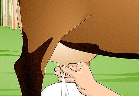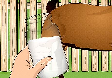 Understand the lactation cycle. Once a doe has produced her first offspring, she will start producing milk and will continue to do so for approximately 305 days following delivery. The milk flow is usually highest 2 to 3 months after giving birth then tapers off towards the end of the lactation cycle. The doe will require a two month "dry spell" before she gives birth a second time and begins producing milk again - an event which is known as "freshening" in the dairy world. If you have never milked an animal before, it is important to get the technique right. Rather than tugging on the teat, you need to wrap your hand around it, cutting off the milk supply at the top using your thumb and forefinger. Then you can use your other fingers to squeeze the teat and extract the milk. At first, you might find milking to be somewhat slow and awkward, and it could take you up to 30 minutes per goat. But once you get the hang of it you'll be able to do it in a jiffy! You should milk your goats once in the morning and once at night. During peak production, standard-sized goats will produce up to 3 US quarts (3,000 ml) of milk per day, while miniature goats will produce slightly less.