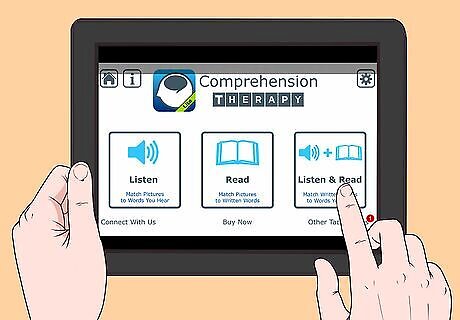 Use a reading comprehension book. Therapists often use reading comprehension exercises, where you read a passage and then try to answer questions about it. You can try this approach at home by buying a reading comprehension book, one either made for children or for adult learners. You can also search for reading comprehension passages online. Read the passages, and try to answer the questions. Have a family member go over it with you if you're having trouble.
