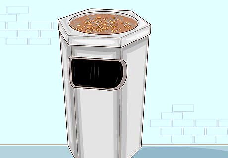 Place used filters in a cigarette-only recycling bin. If you’re outdoors, deposit cigarettes into speciality collection bins. Many cities use these bins to collect filters. Private companies also sometimes have them, so you may see them outside restaurants and other locations. At the moment, these bins are not available in all areas. Make sure the bin is clearly labeled with a sticker or sign indicating it is for cigarettes only. You can get your own bin from a recycling company like TerraCycle or by assembling one. Try placing a plastic liner inside a metal or plastic bin. If you own a bin, it is your responsibility to collect the cigarettes and send them to a recycling company.