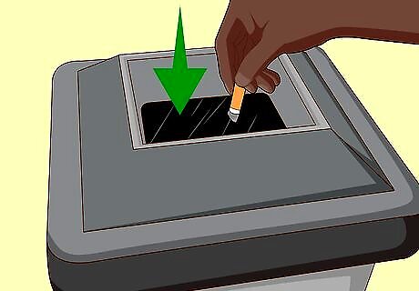 Throw the cigarette into the trash if you have no other choice. If you can’t find an ashtray or bin, extinguish the cigarette and put it into the trash. The filter will end up in a landfill instead of a recycling center, but this is a better option than throwing it on the ground. Avoid fires by making sure the cigarette isn’t lit or emitting smoke before you throw it away.