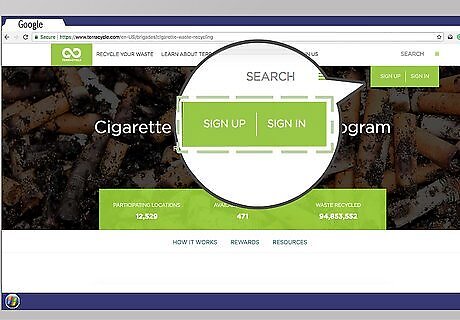 Join a recycling site online. Search online for “cigarette recycling” sites. There are a few options out there, such as TerraCycle. You will need to create a free account before you can ship the cigarettes. A few cities now offer recycling programs of their own. Check with your local government and trash disposal service to see if this is an option.