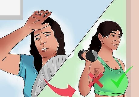 Know what a hot flash is. Hot flashes generally occur in the upper part of a woman’s body. Most often they occur on the face, chest, breasts, and neck. You may feel suddenly or progressively as though you are overcome by an intense heat from your body, which may be incredibly uncomfortable. Your skin may redden and you may begin to sweat. Hot flashes generally last for a few minutes. Hot flashes are not well understood, but are thought to be caused by changes in the body’s thermostat and that these hypothalamic changes are brought about by the hormonal fluctuations that occur during perimenopause, particularly changes in estrogen. Testosterone and other factors, including endorphins released during exercise, can play a role as well. You cannot predict or control when hot flashes strike. Easing or reducing their occurrence with exercise can help you feel you have at least some control over the situation. Strength training in particular can help build a sense of control and empowerment as you become stronger and more coordinated.