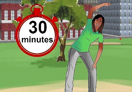 Exercise for an appropriate amount of time. You need to make sure you exercise long enough to get the benefits of the activity. Only doing it for a few minutes or once every week or two will not be enough to make a difference. When you begin, try for at least 30 minutes of physical activity at least four to five times a week. You can also split the 30 minutes into 10 minute increments throughout the day. You can increase this amount of time as you get more fit, aiming for a total of 150 minutes each week.