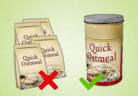 Purchase food from bulk bins and store it in reusable containers. Buying foods like cereal, flour, pasta, dried fruit, and rice from the bulk section can save you money as well as lots of plastic packaging. Instead of bagging bulk foods up in plastic bags, bring your own reusable bags or containers to store them in. Cotton bags, glass jars, and stainless steel containers are several waste-free storage options. If you’re worried about how your containers will affect the weighing and paying, go to the customer service desk. Most stores have weighing options for personal containers, and cotton bags usually have their weight printed on the bottom to make the process easier.