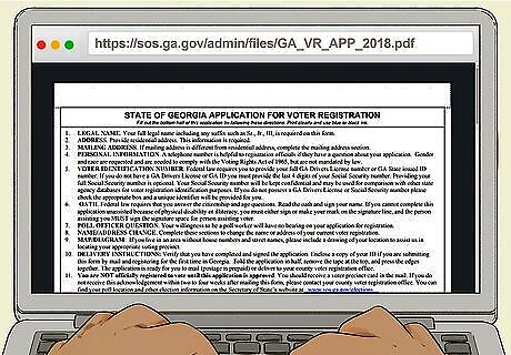 Get a copy of the registration form online or from a local government building. Look on the website for Georgia’s Secretary of State for a fillable PDF copy of the application. If you don’t have access to the internet or a printer, check with your county’s registrars’ or election office to pick up a copy of the application so you can fill it out. You may also be able to find copies of the registration form at your local library, schools or universities, and other government offices. You can find a printable PDF of the application here: https://sos.ga.gov/sites/default/files/forms/GA_VR_APP_2019.pdf.